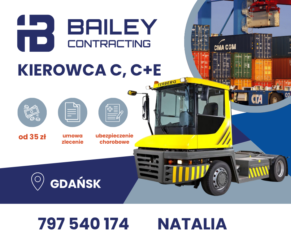 Bailey Contracting Sp. z o.o. poszukuje osób chętnych do pracy w porcie Gdańska jako operatora ciągnika siodłowego, nie wymagamy doświadczenia portowego.
