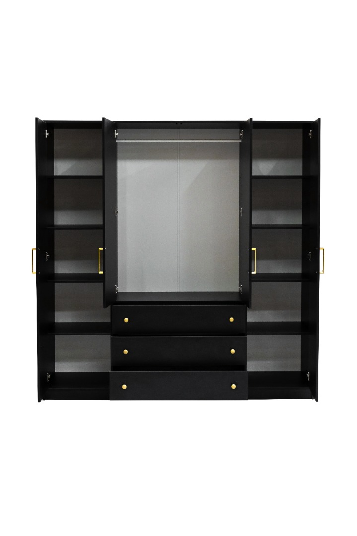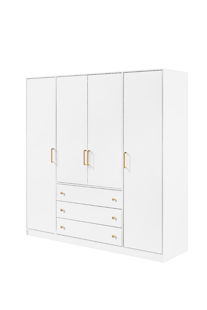 Dzięki czystej, białej formie i złotym detalom, mebel ten nie tylko pomieści całą garderobę, ale również stanie się eleganckim punktem centralnym sypialni lub przedpokoju.
